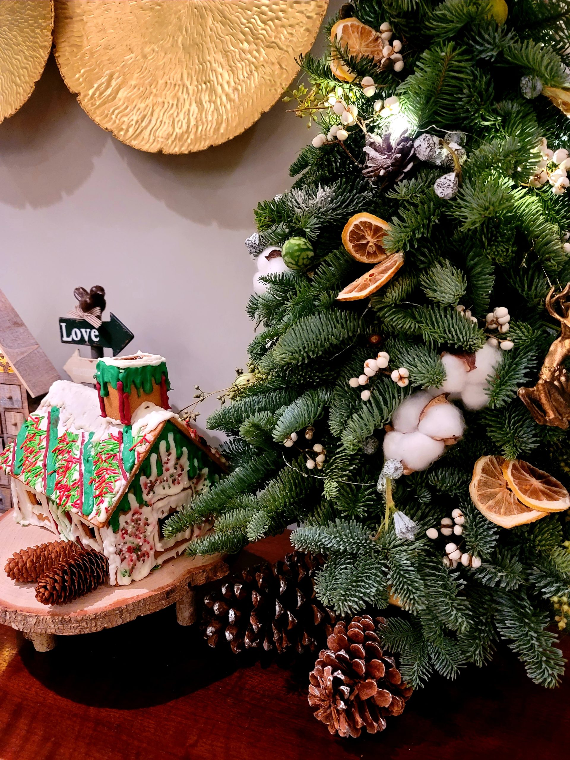 Style your buffet table with festive elements like ornaments, candles and flowers. Anyone can do this, so don’t be afraid to get creative. I especially love using wood log candle stands.