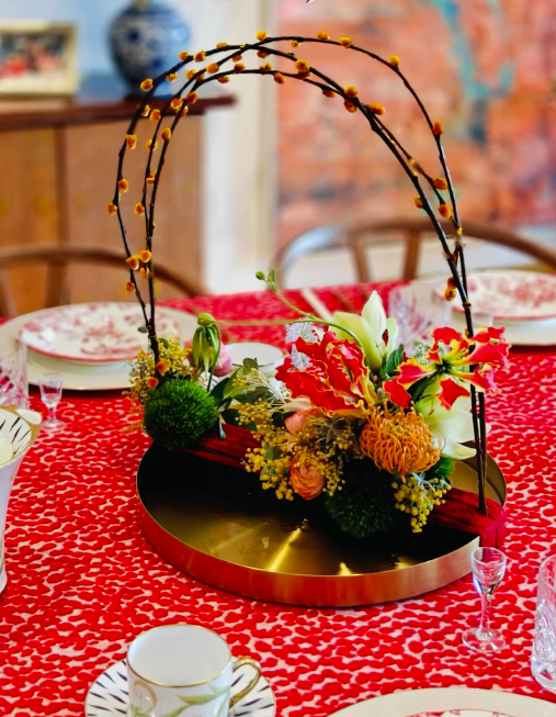 If you’ve ever wanted to explore something more expressive, start by thinking in layers. Build upward with a sculptural element such as an arch or branch structure that frames the space instead of blocking it. Then soften the base with low, abundant florals that spread outward. This contrast between height and grounded blooms keeps the table feeling open while still delivering that sense of delight. Choose flowers with varied shapes so the arrangement feels alive and organic rather than stiff. Let a few stems reach, curve, and wander. That movement is where the emotion lives.