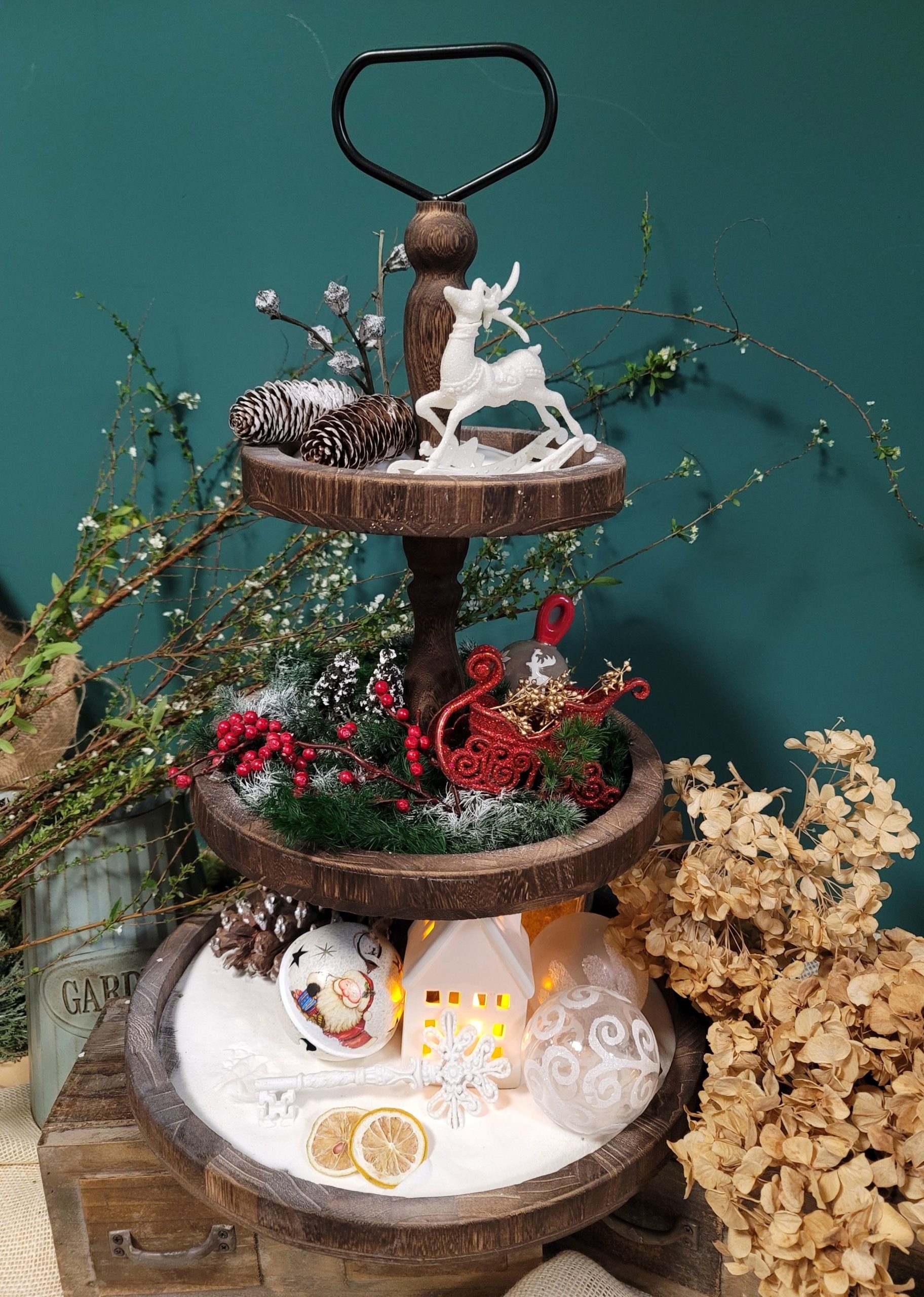 A plain driftwood can be dressed up with a variety of objects and flowers to design a unique display centerpiece.