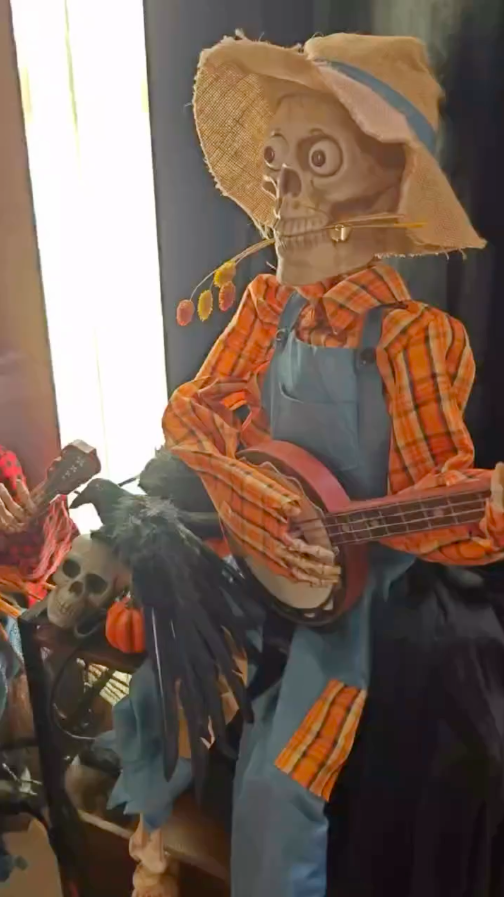 There’s something deeply satisfying about letting the house transform with the season. This year, I went full maximalist for our haunted home. Skeletons guard the doorway, glowing pumpkins light up the steps, and there’s a mischievous spirit in every corner sometimes literally. Tiny details hide in plain sight: a crow perched above a mirror, a soft flicker of amber light behind sheer curtains, the faint scent of clove and cinnamon that makes the air feel alive.